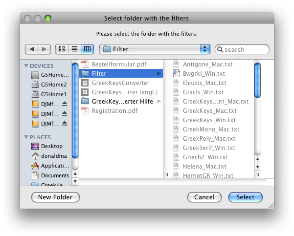 NOTE: if at any point in using the converter, a dialog appears asking you to locate the filter folder, you need to navigate to the folder entitled Filter which you should find inside the same folder as GreekKeys Converter. Once you highlight that folder and hit return to close the dialog, you should be able to continue without a problem.